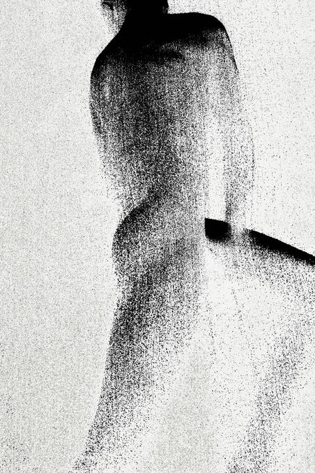 The high-contrast and granular textures evoke a sensation of atomic or quantum "noise", visualizing the idea that all matter is in constant flux at a microscopic level. The presentation of the human form as indistinguishable from its environment without the presence of light energy is a challenge to our perceptions of individuality and separation from nature, from reality.